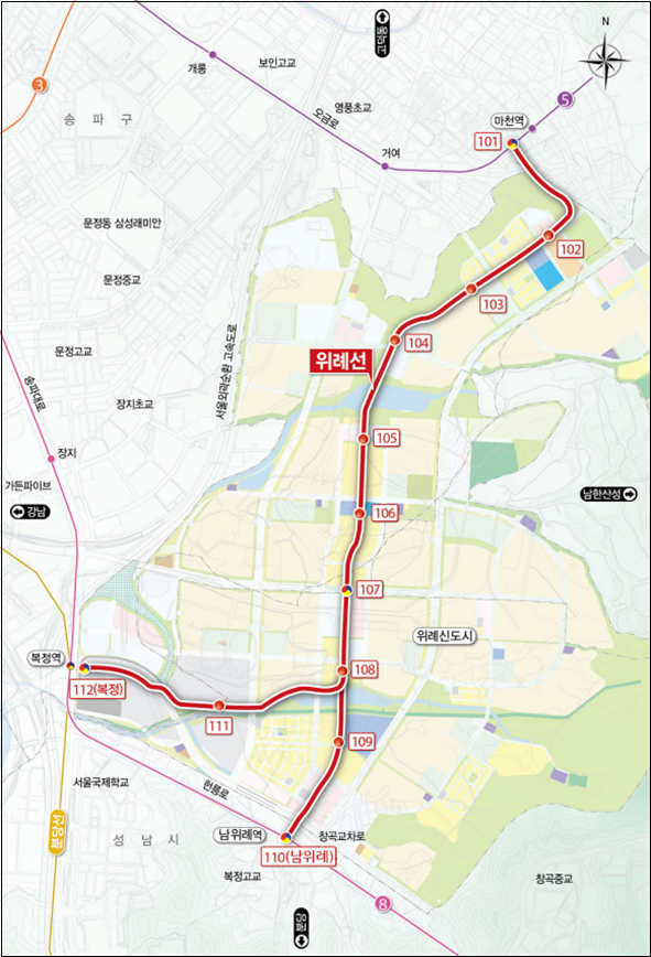 The 5.4km Wirye Line (위례선) will be located in Wirye New Town, a new urban development in the south-east of Seoul with sections in Seongnam in south-east Gyeonggi Province.